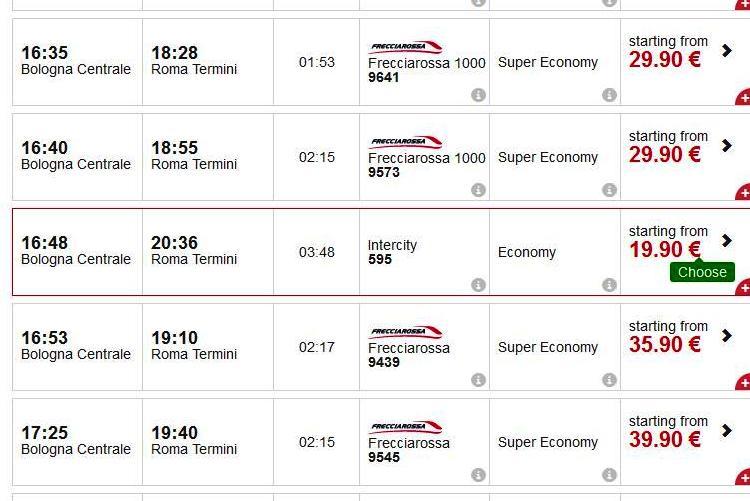 Отправление всех поездов в Рим происходит от станции Stazione di Bologna Centrale, прибывает поезд на железнодорожную станцию в Риме Термини.