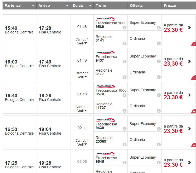 Но лично мне это не доставляет большого неудобства, поэтому я отправилась в Пизу именно таким образом. Первый поезд выезжает с центральной железнодорожной станции Bologna Centrale в 05.08, последний – в 21.25. В Пизе на станции Pisa Centrale вы будете приблизительно через 2-2,5 часа.