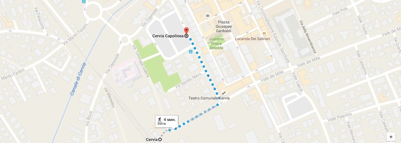 Прибыв на железнодорожную станцию Cervia в 10.30, мы прошлись до остановки автобусов Cervia Capolinea. Подождав несколько минут, сели на автобус 176 и через пять минут вышли в Милано-Мариттимо на улице Piazzale Forli.