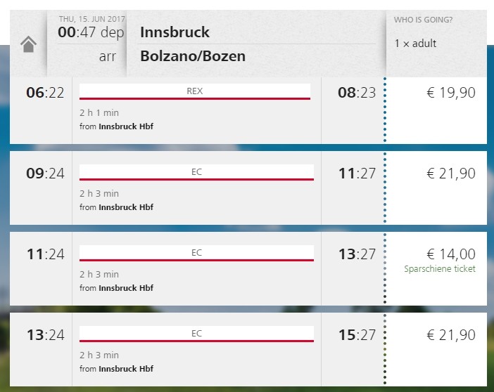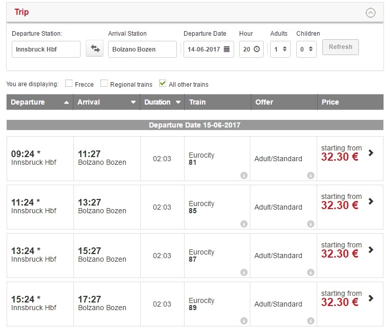 Прямых рейсов не очень много. Если не удастся воспользоваться такими поездами, можно путешествовать и с пересадкой, например, в Бреннере. По времени получается практически то же самое.