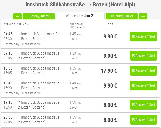 Ниже приведена информация о том, сколько часов вам потребуется, чтобы добраться от Инсбрука до Больцано, а также приведена примерная стоимость проезда (средняя цена билета) на том или ином виде транспорта.