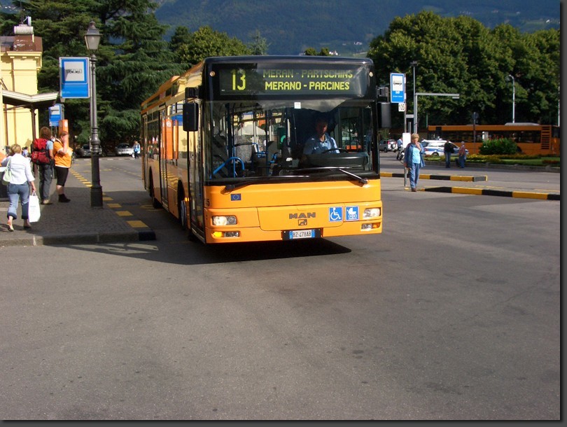 Искомый автобус имеет номер 201. Как видно, сесть на автобус можно как на автостанции, расположенной по адресу Via Dr. Julius Perathoner, 39100 Bolzano, так и на железнодорожном вокзале. Прибывает же автобус на железнодорожный вокзал в Мерано. По времени следования автобус едет примерно 50 минут.