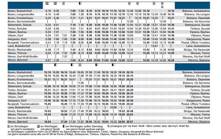 Местом отправления является автостанция Больцано, прибывает же автобус на железнодорожный вокзал вокзал в Мерано. Можно выйти и раньше, на другой остановке. С расписанием можно ознакомиться на сайте компании. Ходят автобусы с утра (с 05:43) и до поздней ночи (23:53), с интервалом примерно в полчаса.