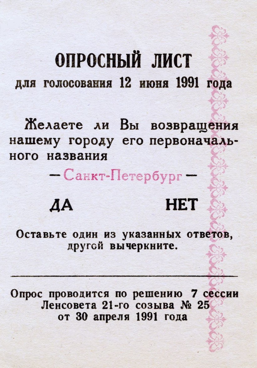 После избрания в 1990 г. первого демократического Ленсовета, появилась инициатива о переименовании Ленинграда. Но только в апреле 1991 г. депутатам удалось договориться о проведении опроса жителей северной столицы. Референдум был совмещен с выборами президента России и мэра Ленинграда, назначенными на 12.06.1991 г.