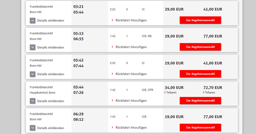 Зайдя на сайт Deutsche Bahn, я увидела, что первый поезд отправляется в 03:21. В течение дня, поезда выезжают в каждые полчаса (иногда и чаще). Последний состав отправляется в половине двенадцатого ночи. В дороге нужно будет провести полтора-два часа, то есть добраться на поезде даже быстрее, чем на автомобиле.
