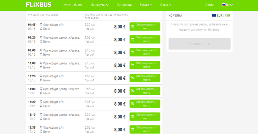 Приобрести билет на автобус проще всего на портале FlixBus. Сайт русскоязычный, поэтому забронировать билет труда не составит.