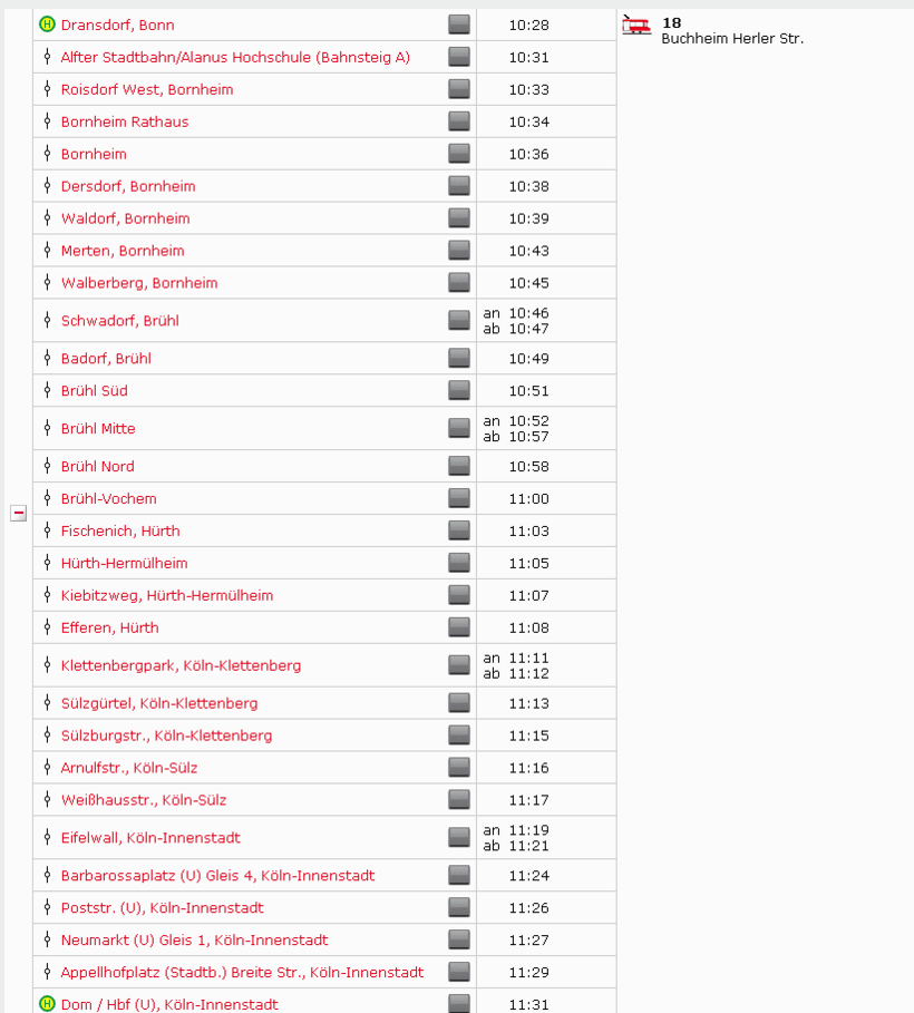 Ниже приведена информация о том, сколько часов вам потребуется, чтобы добраться от Бонна до Кёльна, а также приведена примерная стоимость проезда (средняя цена билета) на том или ином виде транспорта.