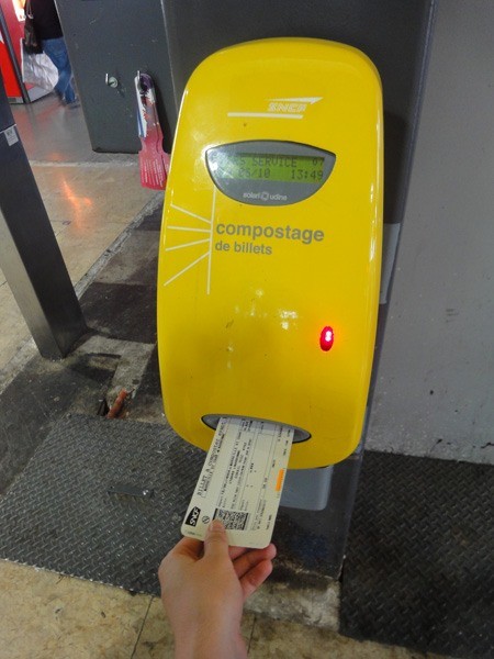 При посадке в поезд необходимо прокомпостировать билет в специальных компостерах. Они ярко жёлтого цвета и, как правило, установлены при выходе на перрон.