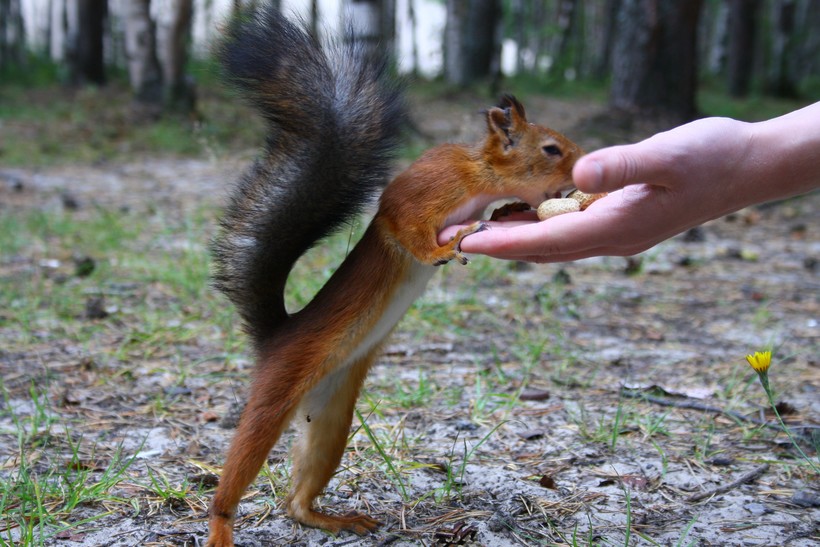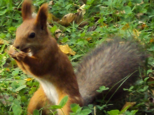 Чудо-зверек любит кушать с рук. Причем часть орехов он съедает сразу, а часть относит к себе в дом, ну или зарывает в землю. Вот такие белки запасливые!Кстати, белки очень быстро и легко приручаются к людям, которые их подкармливают. Поэтому достаточно всего пару раз покормить грызуна на одном и том же месте для того, чтобы он запомнил «кормильцев». Я, например, уже не бегаю по парку в поисках белок. Просто прихожу на определенное место и шуршу пакетом с угощениями. Кроме орехов пушистые зверьки любят ягодки, грибочки, фрукты.