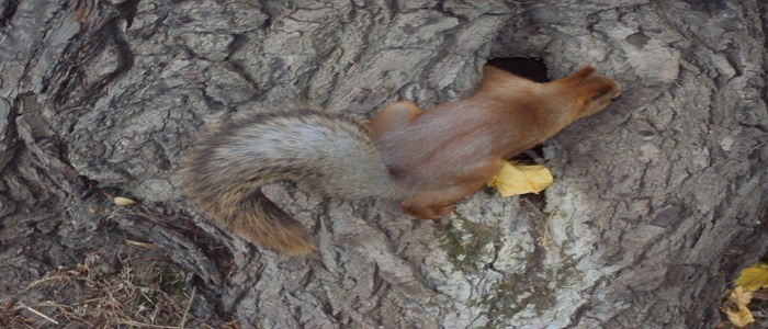 Встретив в лесу очередного попрыгунчика, пытаюсь тихонько за ним следовать. Но догнать белку оказывается совершенно невозможно. Она мгновенно ускользает от взгляда. То тут, то там только мелькает ее красивый пушистый хвост, который, кстати, по длине почти равен размеру всего тела грызуна (2/3). Затея близка к провалу. Но не теряя последнюю надежду, просто иду в глубь леса в поисках белкиных жилищ. Вот и оно. Дупло белки. Его размер примерно равен 25-35 см. Белку можно назвать отличной домохозяйкой. В дупле все качественно обустроено. На дне подстилка из листьев, прутьев, шерсти, трава. Щели предусмотрительно заделаны мхом. Причем у белки не одна «квартира», а штук 15 по всему лесу. Каждые 3 дня грызун меняет убежище. Кроме того, в каждом дупле имеется запасной ход, чтобы в случае опасности можно было быстро сбежать. Самцы-белки более ленивые. Не тратят время на обустройство дома, а занимают пустые гнезда птиц.