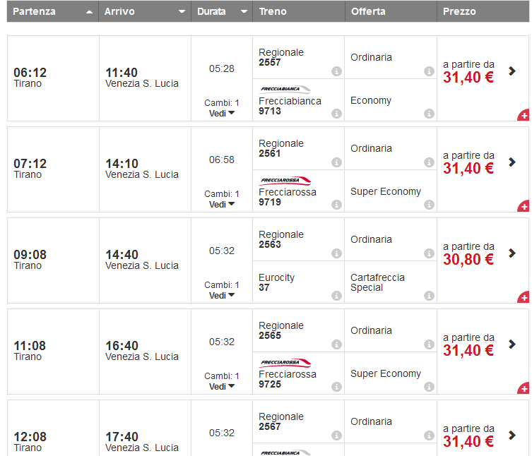 В Тирано все автобусы делают остановку на привокзальной площади, откуда и отправляются поезда в сторону Венеции. Добираться в Венецию придется с пересадкой, но это не доставит лишних проблем: график движения поездов составлен таким образом, чтобы пассажирам не приходилось тратить слишком много времени на ожидание очередного состава. В среднем в дороге нужно будет провести около 6 часов. Между городами курсируют составы различных категорий; ознакомиться с информацией, чем один поезд отличается от другого, можно здесь.
