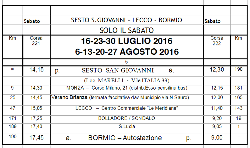 Ежедневно до Милана (а точнее до остановки Sesto S. Giovanni, которая находится на краю города) курсирует один автобус компании Busperego. Он отправляется с автостанции Бормио ровно в 09:00, прибывая на конечную остановку в 12:30.