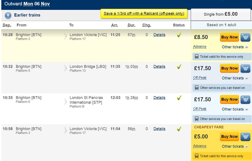 Самый дешевый билеты стоят 5 фунтов (5,5 евро), обычно это на поезда до станции London Victoria [VIC]: