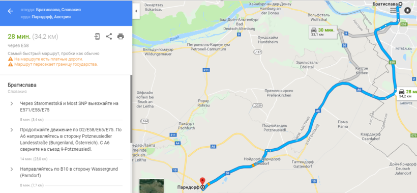 Что касается границы между Словакией и Австрией, то это просто линия на карте, никаких пограничников и проверок документов. :) А о качестве дорог в этих странах можно только мечтать – оно просто чудесное. Ехать не долго, всего лишь 35 км и полчаса времени!