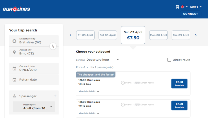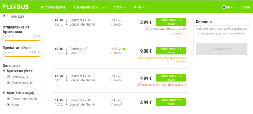 Вот такой популярный маршрут, что еще и третий перевозчик на нем работает! У Eurolines по вторникам и четвергам есть прямой рейс в 12:00, а по воскресеньям добавляется еще и отправление в 18:00. Выезд – с того же автовокзала Братиславы, что и выше описанные перевозчики, прибытие – на Zvonařka 411 в Брно. Услуги в салоне такие же, как у Flixbus.