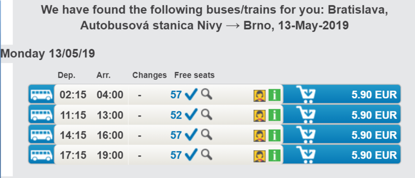Отправляются автобусы от автовокзала Братиславы, который находится на Bottova 7. В Брно два места, куда происходит прибытие: автовокзал на Zvonařka 411 и автостанция возле отеля Grand (Benešova 603/2). Внимательно смотрите в расписании, куда едет ваш автобус. В пути нужно будет провести от полутора до двух с половиной часов.