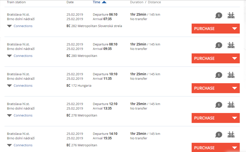 Это легко сделать как в кассе вокзала, так и в терминалах или на сайтах словацких и чешских железных дорог.
