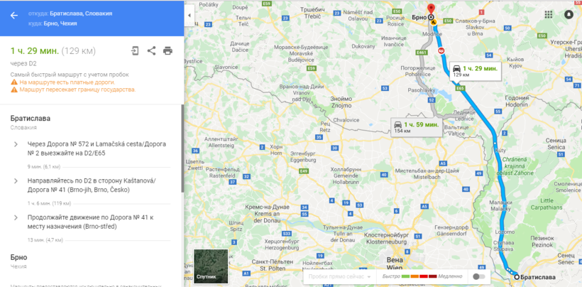 Братислава — Брно — маршрут на карте