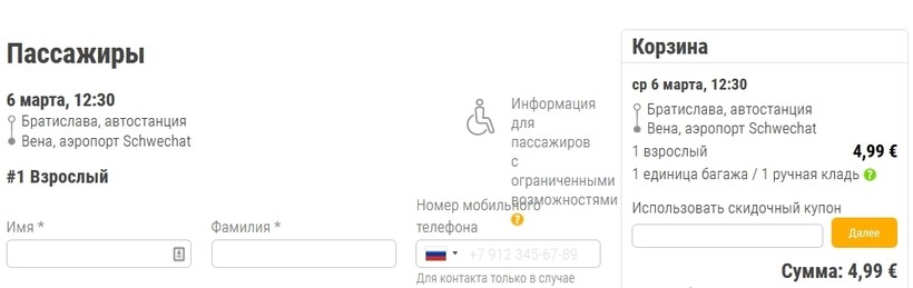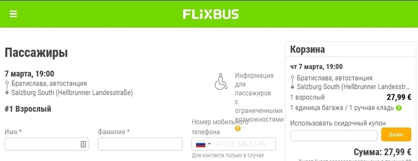 Билет на автобус Flixbus — 4,99 €.