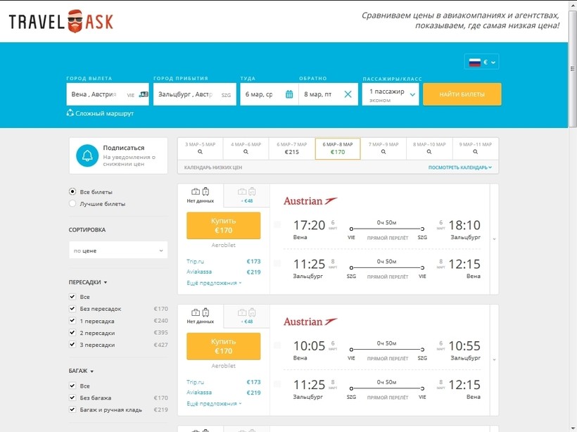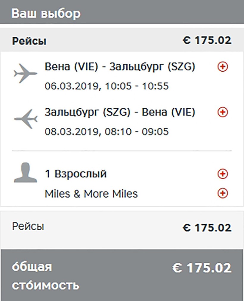 Билеты в оба конца на самолет «Австрийских авиалиний» — 175 €.
