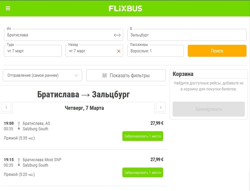 У перевозчика Flixbus 5 раз в неделю (кроме вторника и среды) есть прямые рейсы в Зальцбург. Правда, ехать долго — 5 часов 35 минут. Да и расписание неудобное: из Братиславы выезд вечером (19:00), а в Зальцбург автобус приходит уже ночью (00:35).