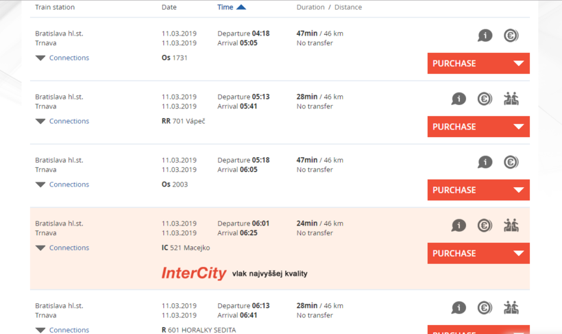 Прямые составы ходят из столицы до Трнавы с 4:18 до 23:28 с разрывом от нескольких минут до часа.