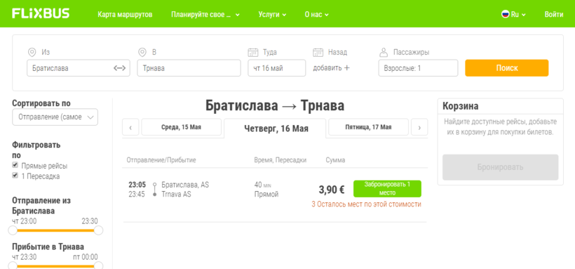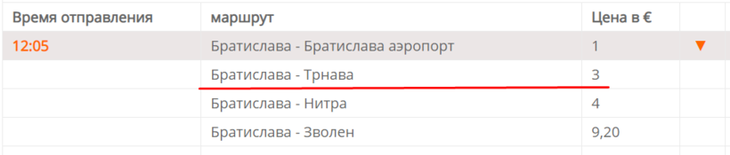 У местного перевозчика Ulicky я нашла еще один рейс до Трнавы. Автобус отправляется от Центрального автовокзала в 12:05, по дороге заезжает в аэропорт Братиславы, чтобы забрать пассажиров, и в 12:55 прибывает на автовокзал Трнавы. К сожалению, я не нашла информации о сервисе в салоне.