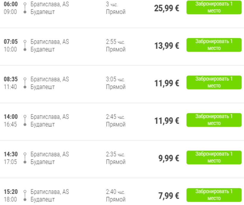 - выезд из Братиславы в 07:05 и прибытие в Будапешт в 10:00;