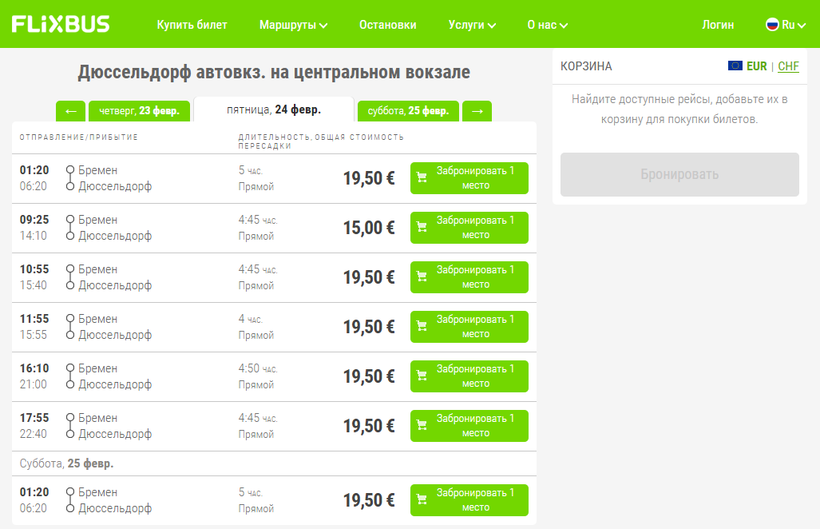 Сайт «Flixbus», один из самых удобных сайтов, которым мне доводилось пользоваться. Здесь очень понятно всё написано, кроме того, есть поддержка русского языка.