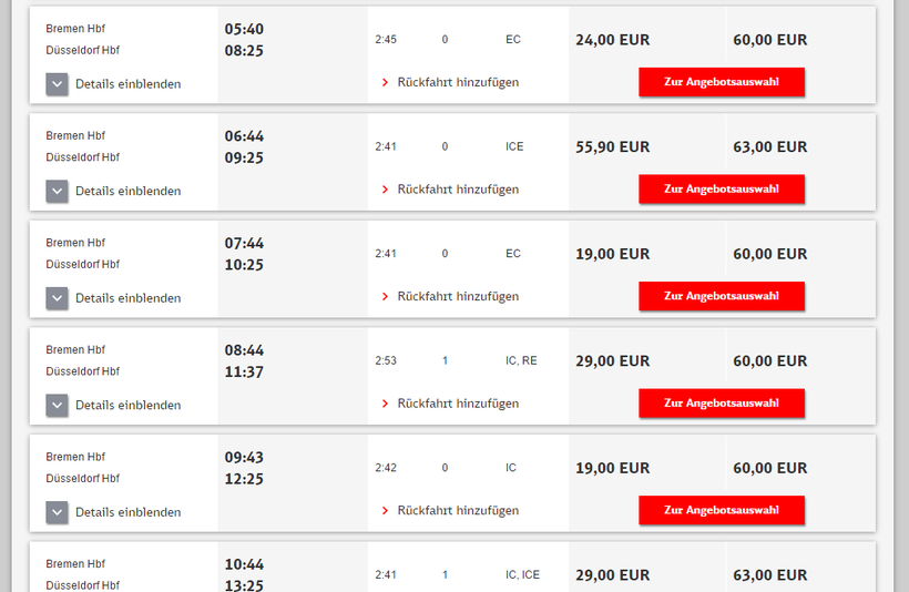 Вот пример расписания поездов Бремен – Дюссельдорф с официального сайта.