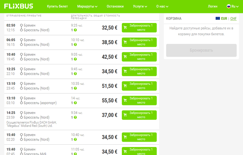 Кроме фирмы «Eurolines» из Бремена в Брюссель можно уехать на автобусе «Flixbus», это тоже крупный европейский перевозчик. Но у «Flixbus», нет удобных рейсов, прямые автобусы в Брюссель отправляются вечером и приезжают в столицу Бельгии около пяти утра, стоит такое удовольствие в районе 25 евро. На мой взгляд это не самое удачное время. Когда ты не можешь толком поспать ночью, тело затекло от автобусного кресла, и тебя высаживают в пять утра, вокруг почти ничего не работает, нельзя ни в кафе зайти, ни ещё куда-то, и часто ещё не начал ходить общественный транспорт... В этом удовольствия мало. К тому же у «Eurolines» я нашёл более дешёвые билеты. Можно доехать до Брюсселя автобусом «Flixbus» с пересадкой в Амстердаме или Кёльне, но это занимает не меньше 9 часов, и цена такого маршрута естественно выше, она начинается от 32 евро. Все подробности по маршрутам компании «Flixbus» можно узнать на их официальном сайте.