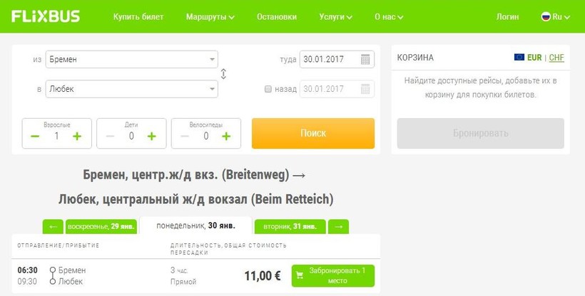 Автобусный перевозчик Flixbus совершает прямые рейсы от автостанции (Breitenweg, 13), которая находится рядышком с ЖД вокзалом Бремена. Правда, не каждый день можно ухать напрямую до Любека. По понедельникам, четвергам и пятницам рейс отправляется в 06:30, по субботам – в 06:45, по воскресеньям – в 07:45. В дороге нужно будет провести от 2 ч 45 мин до 3 ч. Учитывая, что в автобусах есть и кондиционеры, и бесплатный интернет, и туалет, и розетки, время должно пролететь незаметно. В Любеке остановка находится на Beim Retteich, прямо возле ЖД.