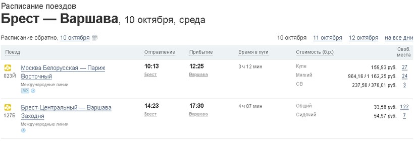 Билет на поезд в Варшаву обойдется не очень и дорого, конечно, все зависит от типа места, которое вы выберете. Также большую роль играет и рейс. Есть, например, поезда, где только сидячие и общие места, а есть с купе, СВ и т. п.