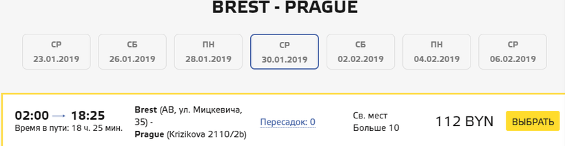 Билет на прямой автобус из Бреста до Праги стоит 112 BYN (3500 руб или 45 евро).