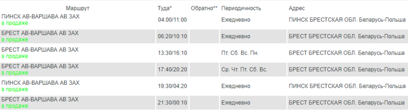 Из Бреста в Варшаву ежедневно можно попасть пятью-шестью рейсами за 6 часов. Следуют по маршруту большие мягкие автобусы марок «Неоплан», «МАЗ» и IRISBUS MASTER.