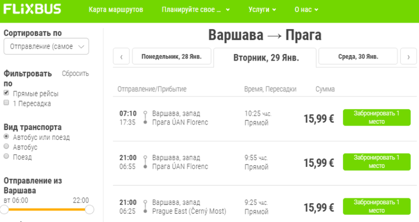 А с автовокзала «Варшава-Западная» в Прагу ежедневно можно уехать прямыми рейсами компании FlixBus в 07:10 и 21:00.