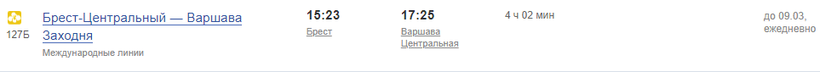 Отправиться в Варшаву на поезде из Бреста можно ежедневно в 15:23 и прибыть на вокзал «Варшава-Центральная» в 17:25.