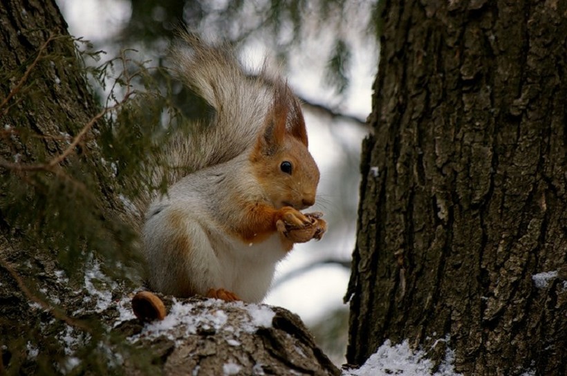 Больше всего белке важно найти еду, ведь она не сможет искать пропитание под слоем снега. Ничего не остаётся, как делать заначки уже с осени, а то и с лета, ведь это на самом деле поможет пережить зимнее время года. Заначка делается из: