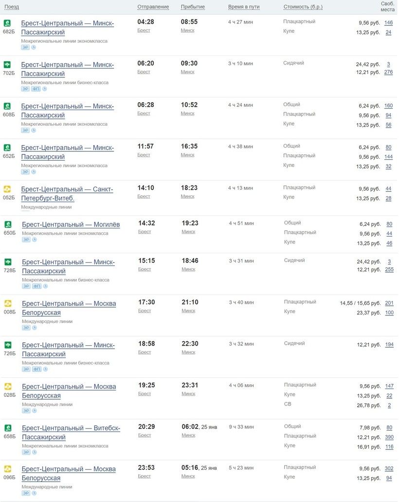 Ездит полтора десятка поездов, так что можно выбрать максимально удобный вариант. Отправление всегда с Брест-Центральный, а прибытие на Минск-Пассажирский (площадь Привокзальная 3).