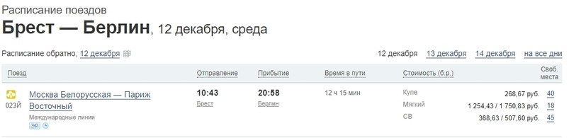 - места в мягком вагоне, которые стоят от 1 254 белорусских рублей (524 евро).