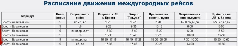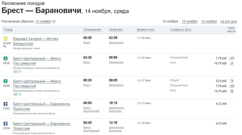 Доступных рейсов много, начиная с полуночи в сторону Барановичей из Бреста ходят поезда. Подробно график их движения можно найти на сайте белорусской железной дороги. Веб страницу я укажу немного ниже.