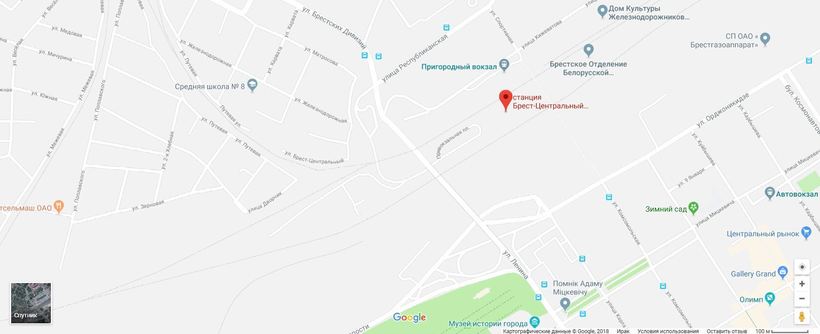 В случае с поездом все будет несколько сложнее. Нужно отправиться на железнодорожный вокзал Бреста, он находится вот тут: