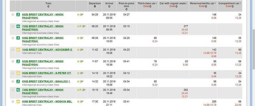 И тут сесть на поезд до Минска. Только через столицу можно доехать до Вильнюса, прямых поездов, увы, нет. Расписание поездов до Минска можно узнать не вставая с дивана вот здесь, на сайте беларусских железных дорог. Я же оставлю тут скриншот: