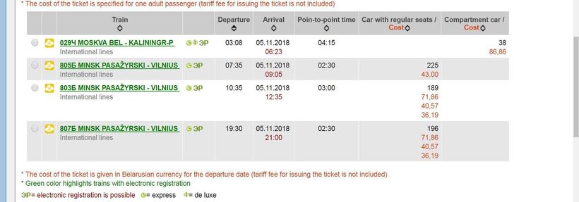 Прибыв в Минск, следует пересесть на поезд до Вильнюса. И вся суть проблемы в том, что таких поездов довольно мало. Вот скриншот, на него поместились все поезда до Вильнюса на произвольную дату: