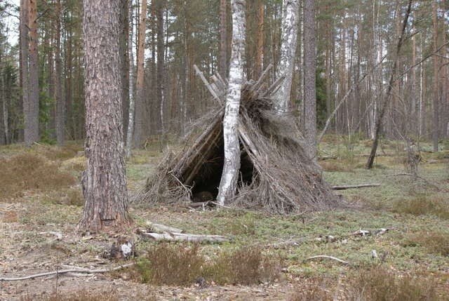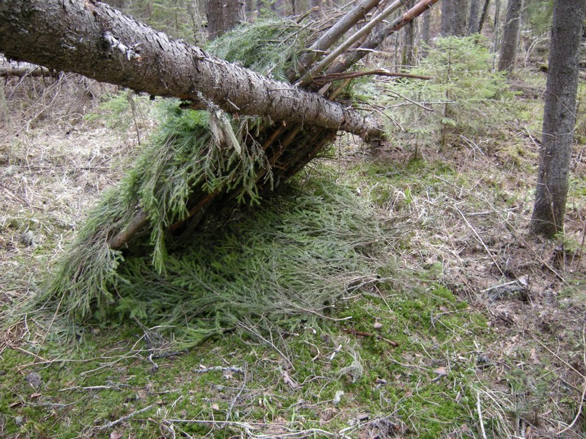 Простейший вариант — это еловый лапник. Натяните имеющуюся бечевку между стволами деревьев, стоящих на расстоянии около 1,5 метра, укладывайте длинные жерди одним концом на бечевку, а вторым на землю, таким образом у вас должен получиться домик типа «вигвама». Далее укройте жерди мелким еловым лапником в несколько слоев. Из того же лапника оборудуйте лежак. Снаружи убежища проделайте неглубокий ров, который будет отводить от него воду. На входе в «домик» вы сможете смело разводить костер (небольшой, дабы ваше жилье не воспламенилось), ложиться спать нужно ногами к костру.