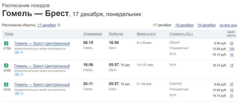 Доехать из Гомеля в Брест можно и на поезде, правда по времени выходит примерно столько же, сколько и в случае передвижения на автобусе. На поездку вы потратите около десяти часов.