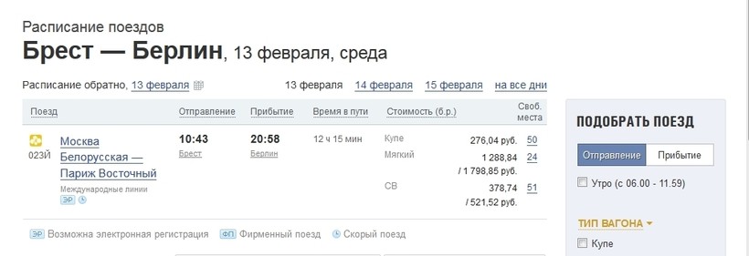 До Берлина нужно ехать поездом 023Й Москва — Париж (по средам).