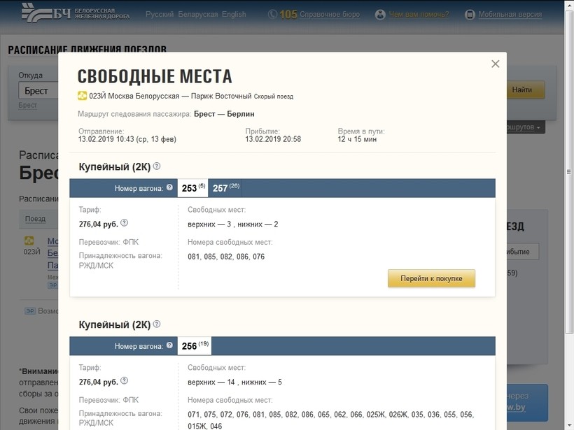 Билеты на поезд 023Й Москва Белорусская — Париж Восточный на сайте Белорусской железной дороги.