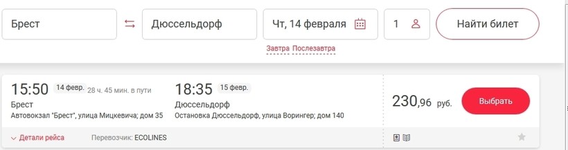 И последний вариант: до Дюссельдорфа можно доехать на автобусе. Это рейс от перевозчика Ecolines с пересадкой в Варшаве.
