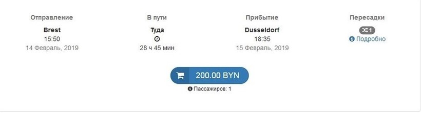 Ниже приведена информация о том, сколько часов вам потребуется, чтобы добраться от Бреста до Дюссельдорфа, а также приведена примерная стоимость проезда (средняя цена билета) на том или ином виде транспорта.